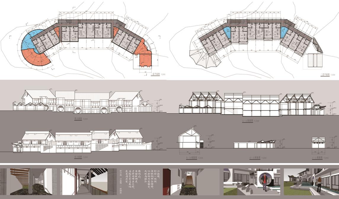 客棧設(shè)計理念來源于“洱海月”,設(shè)計中尊區(qū)域環(huán)境,對當(dāng)?shù)貍鹘y(tǒng)建筑進(jìn)行了傳承與創(chuàng)新,注重與環(huán)境的“融洽相處”。由于基地中存在高差,建筑結(jié)合地形進(jìn)行設(shè)計。大理的“風(fēng)花雪月”聞名于世(下關(guān)風(fēng)、上關(guān)風(fēng)、蒼山雪、洱海月),在設(shè)計中首先考慮的是讓每位游客在客房里都能看到“蒼山洱海”的美麗風(fēng)景,同時讓大家共同擁有一個開闊的院子。