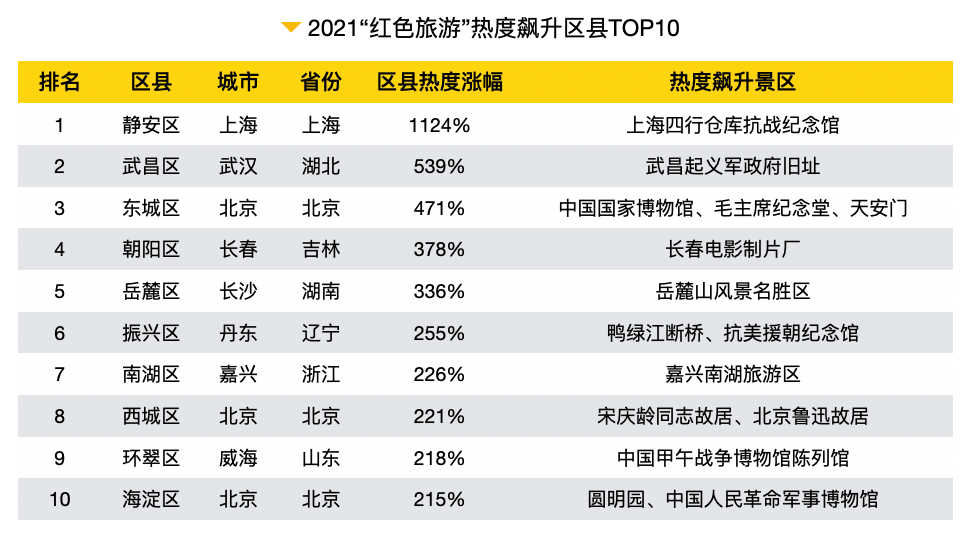 紅色旅游經(jīng)典景區(qū)游客如潮,持續(xù)成為旅游亮點(diǎn)。習(xí)近平總書記先后30余次走訪革命遺址、經(jīng)典景區(qū),持續(xù)引領(lǐng)紅色旅游的熱潮。根據(jù)旅游熱度數(shù)據(jù),2021年經(jīng)典紅色景區(qū)熱度同比增長89%,中共一大會址熱度漲幅243%,井岡山風(fēng)景名勝區(qū)漲幅140%。2021熱度高的紅色旅游經(jīng)典景區(qū)分別是橘子洲、岳麓山、中山陵、中國國家博物館、天安門、圓明園、侵華日軍南京大屠殺遇難同胞紀(jì)念館、渣滓洞監(jiān)獄舊址、黃埔軍校舊址、毛主席紀(jì)念堂、嘉興南湖、蔣氏故居等。