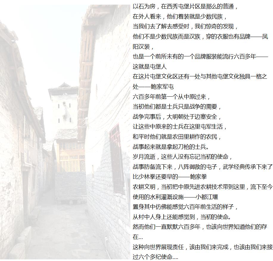 3、鮑家屯是西秀屯堡分布的一個(gè)重要區(qū)域,但歷史上的鮑家屯又是一個(gè)戰(zhàn)爭頻繁的地帶,屯堡至今還保留明朝的生活方式,屯堡民族文化亟待拯救和傳承,需要一個(gè)項(xiàng)目進(jìn)行集中而又深入的體現(xiàn)。
