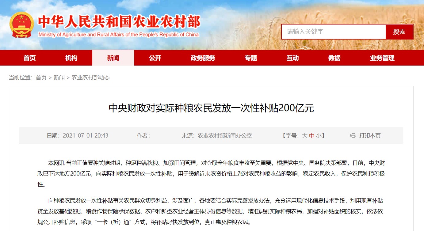 農業(yè)農村部稱,向種糧農民發(fā)放一次性補貼事關農民群眾切身利益,涉及面廣,各地要結合實際完善發(fā)放辦法,充分運用現(xiàn)代化信息技術手段,利用現(xiàn)有補貼資金發(fā)放基礎數(shù)據、糧食作物保險承保數(shù)據、農戶和新型農業(yè)經營主體身份信息等數(shù)據,精準識別實際種糧農民,加強對補貼面積的核實,依法依規(guī)公開補貼信息,采取“一卡(折)通”方式,將補貼盡快發(fā)放到位,真正惠及種糧農民。